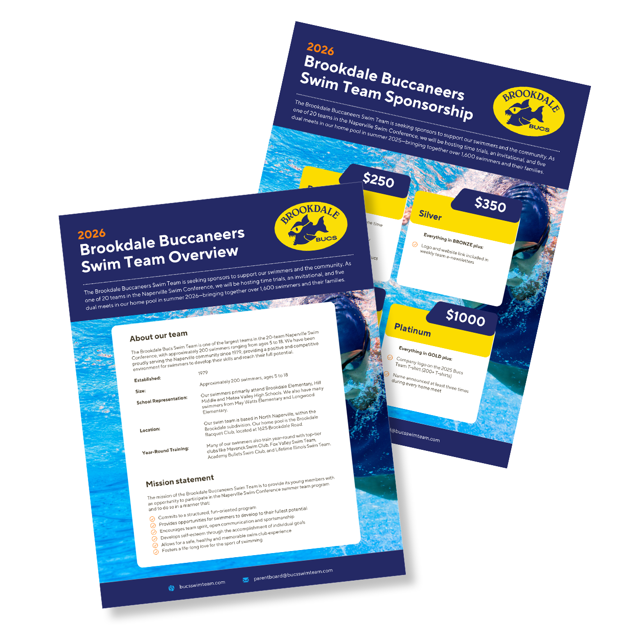 | The Brookdale Buccaneers Swim Team is seeking sponsors to support our swimmers and the community. As one of 20 teams in the Naperville Swim Conference, we will be hosting time trials, an invitational, and five dual meets in our home pool in summer 2026—bringing together over 1,600 swimmers and their families. By sponsoring the Bucs Swim Team, you’ll be helping to support the development of young athletes while gaining visibility for your business or organization. Here are just a few of the benefits you’ll receive: